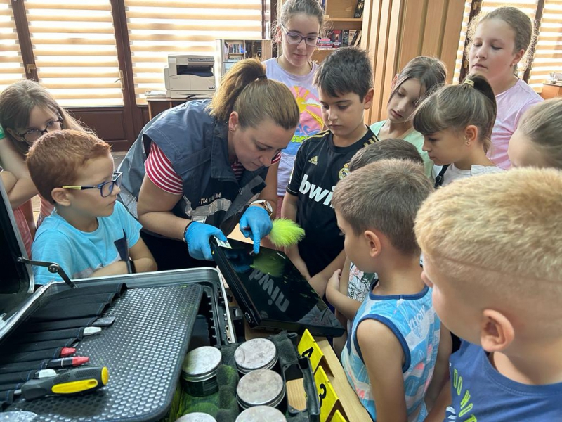 De asemenea, criminaliștii le-au prezentat copiilor trusele specializate și echipamentele criminalistice utilizate în descoperirea urmelor lăsate de infractori, arătându-le modul de prelevare a amprentelor.