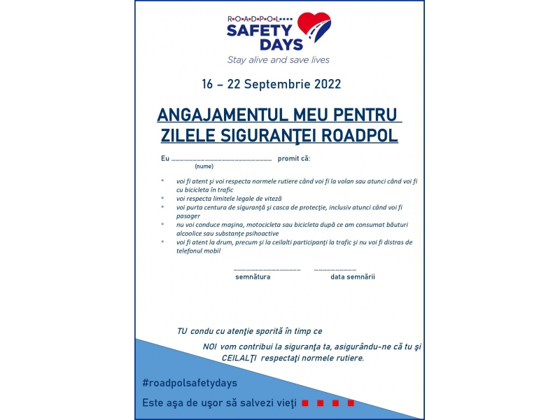Participarea la proiect presupune asumarea unui angajament de respectare a normelor rutiere, ce poate fi transmis de orice persoană interesată, prin completarea numelui și a unei adrese de e-mail validă, la secțiunea Pledge, pe site-ul www.roadpolsafetydays.eu.